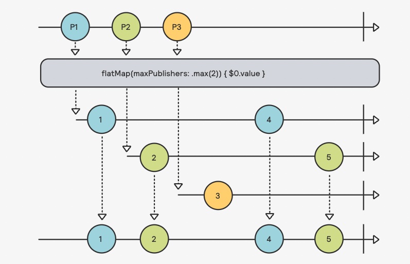 `flatMap`은 수신된 모든 게시자의 출력을 단일 게시자로 평면화 시킨다.