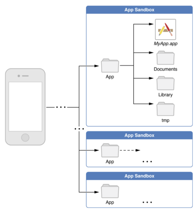 앱을 설치하는 시점에 각각의 SandBox 디렉토리에 위치시키며, 이 디렉토리는 각 앱의 홈 디렉토리가 된다.