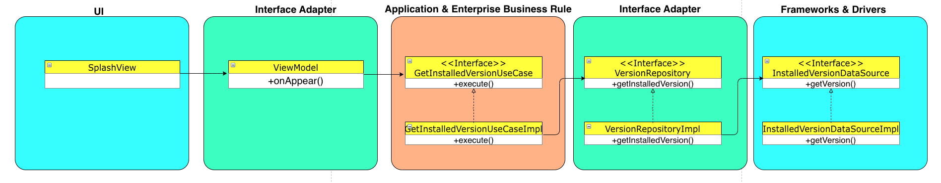 스플래시 화면의 버전정보 표시 과정 다이어그램을 클린아키텍처의 계층으로 나누면 다음과 같습니다.