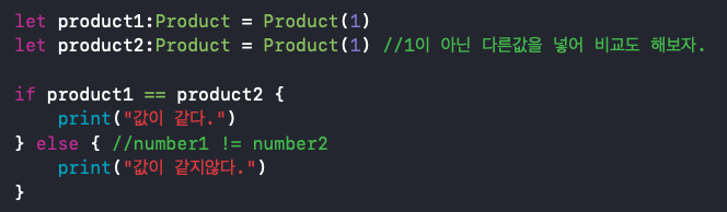 지금 실습할 것은 Equatable을 채택하지 않은 class에 Equatable을 채택하여 비교가 가능하도록 하는것이다.
