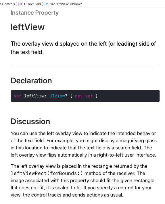 이것을 leftViewMode라는 이름으로 설정해줄 수 있는데, 들어가는 값으로는 열거형으로