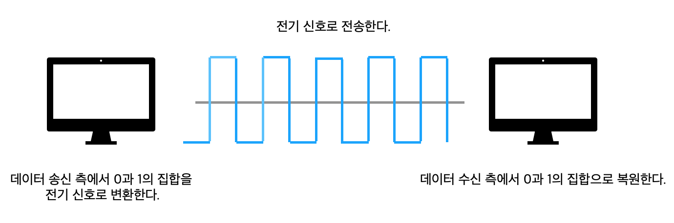 0과 1의 정보가 컴퓨터 내부의 랜 카드로 전송되고 랜 카드는 이것을 전기신호로 변환해준다.
