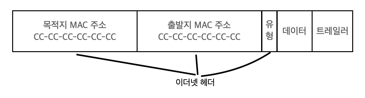 이더넷 헤더의 내용엔 목적지의 MAC주소와 출발지 MAC주소가 포함되어 있다. 데이터가 도달해야 할 주소를 알 고 있으니 전기신호로 데이터를 보내주기만 하면 된다.