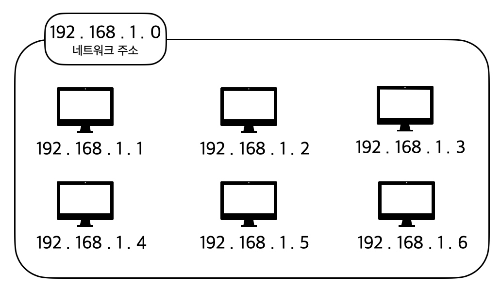그림처럼 192.168.1.1~ 192.168.1.6의 IP 주소를 가진 컴퓨터는 192.168.1.0(네트워크 주소) 의 네트워크에 있다고 할 수 있다.