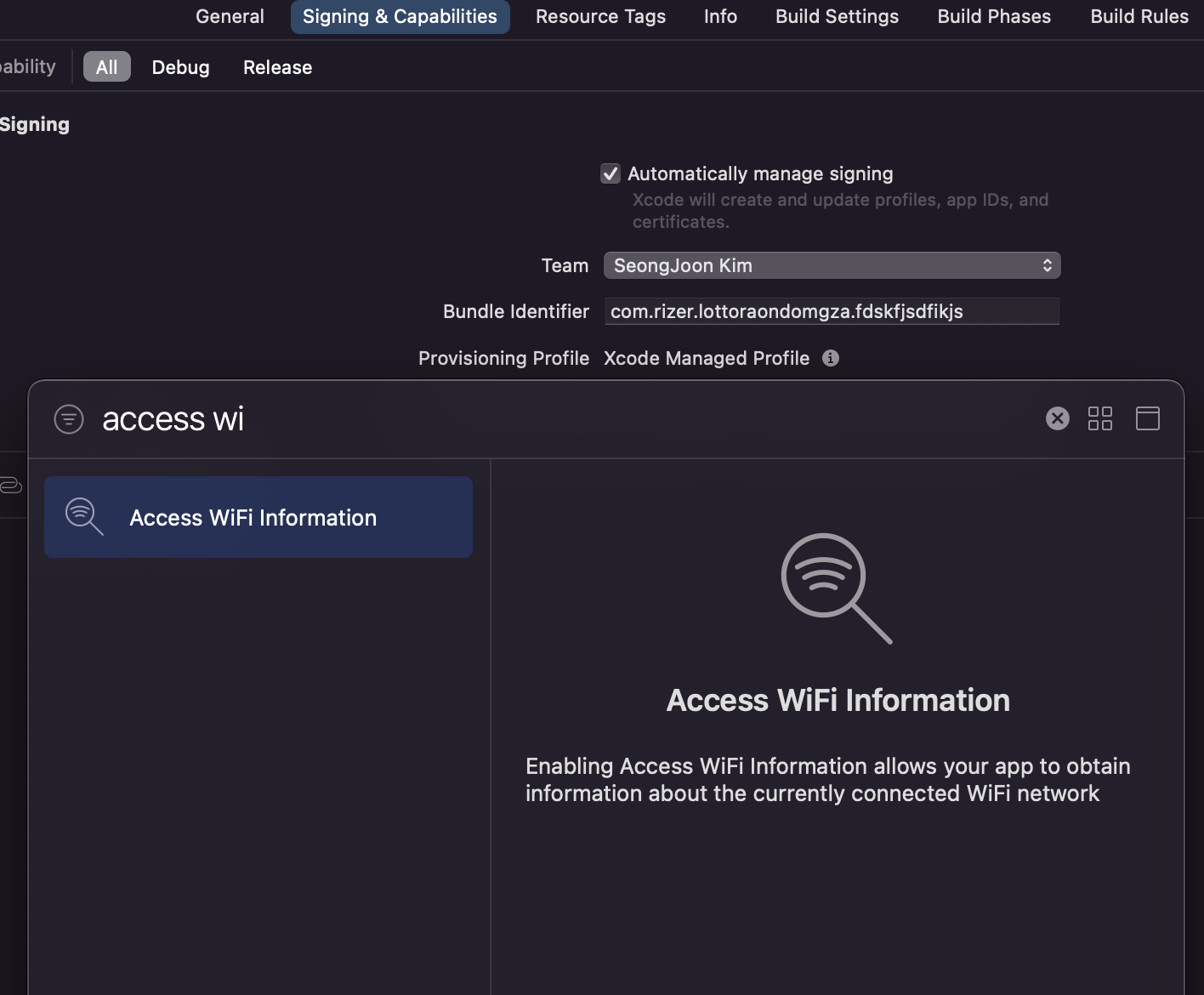 1. Signing & Capabilities에서 '+Capbility'를 눌러 Access WiFi Information을 추가한다.