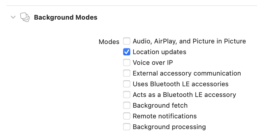 BackgroundModes 가 추가되었다면 Modes목록중 Location Updates를 체크해준다.