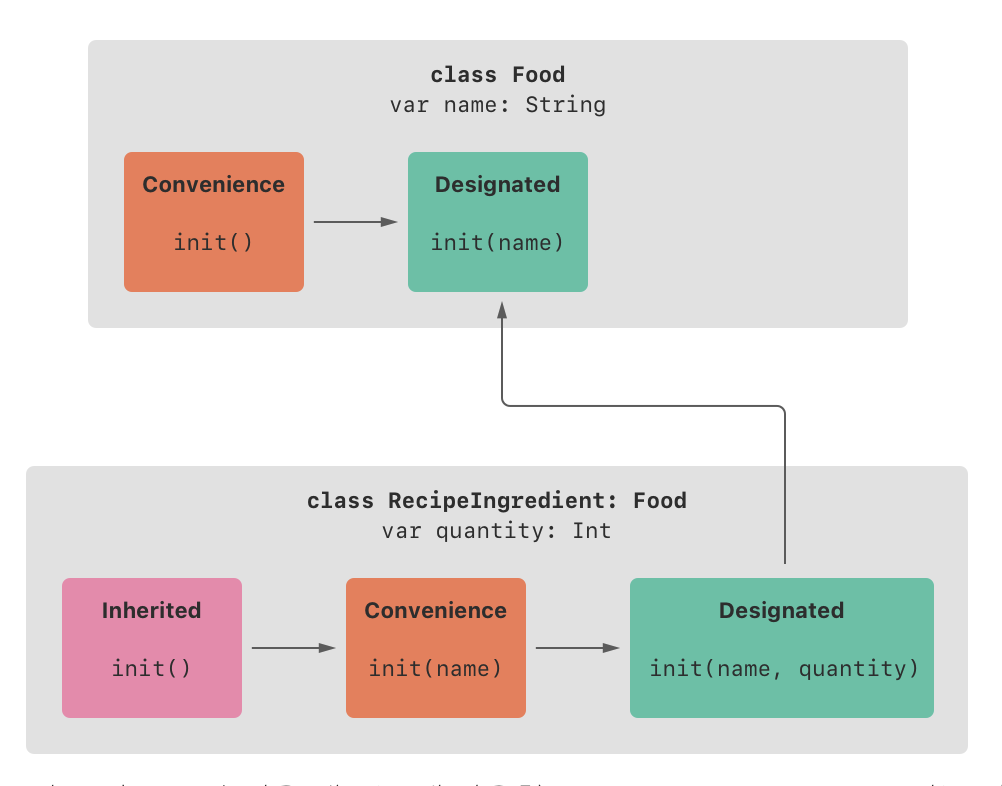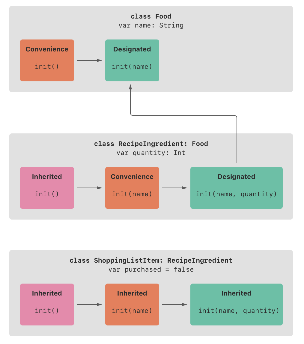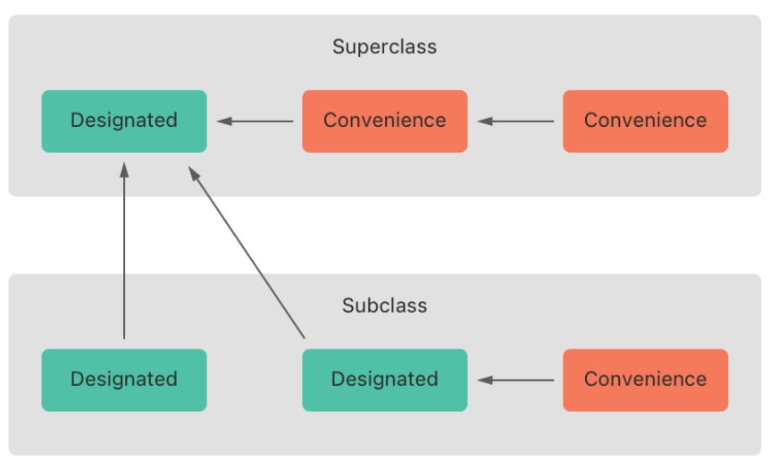 - 지정된 이니셜라이저는 직계 슈퍼 클래스에서 지정된 이니셜라이저를 호출해야만 한다.