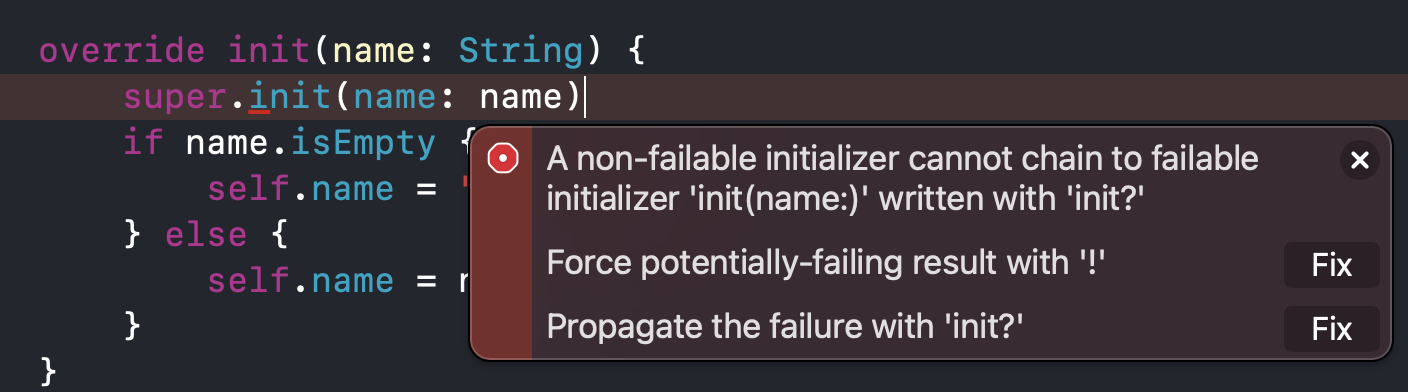 이때 하위클래스의 init(name: String)에서 상위클래스의 실패가능한 이니셜라이저 super.init(name:)를 호출 시도하면 컴파일러는 에러를 발생시킨다.