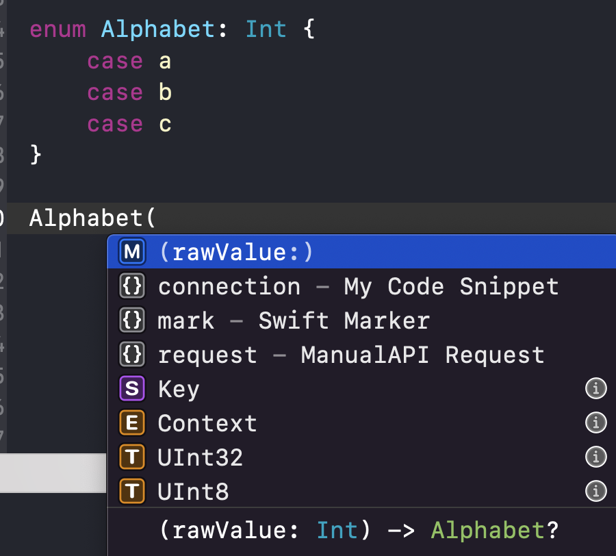 열거형의 초기화는 a,b,c에 해당하는 정수값이 들어오지 못한다면 실패가능한 이니셜라이저를 통해 nil이 반환되도록 이미 만들어져 있다.